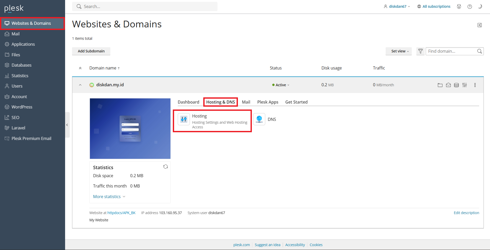 Setelah login ke Plesk, buka Websites & Domains di panel sebelah kiri. Anda akan melihat daftar domain yang Anda kelola di Plesk. Pilih domain yang ingin Anda konfigurasi, dalam hal ini diskdan.my.id.