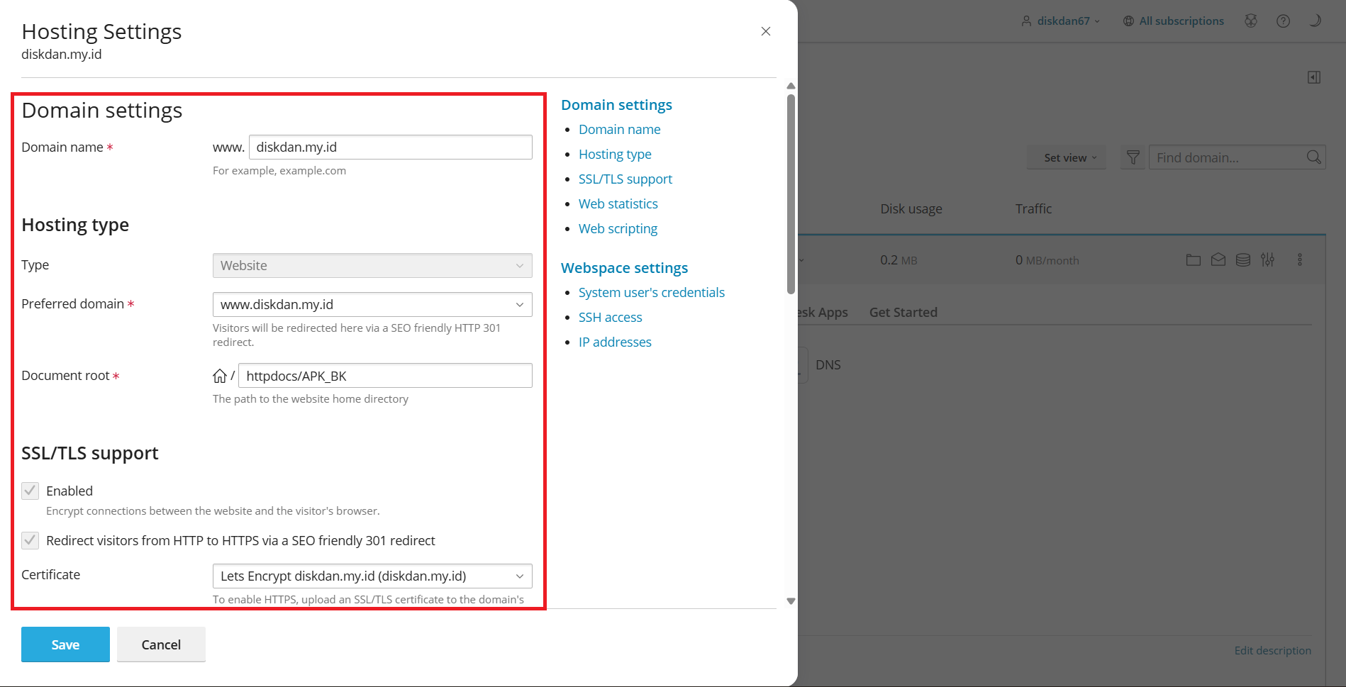 Dengan mengikuti langkah-langkah ini, Anda berhasil mengonfigurasi pengaturan hosting di Plesk untuk domain diskdan.my.id dan memastikan penggunaan SSL/TLS untuk koneksi aman.