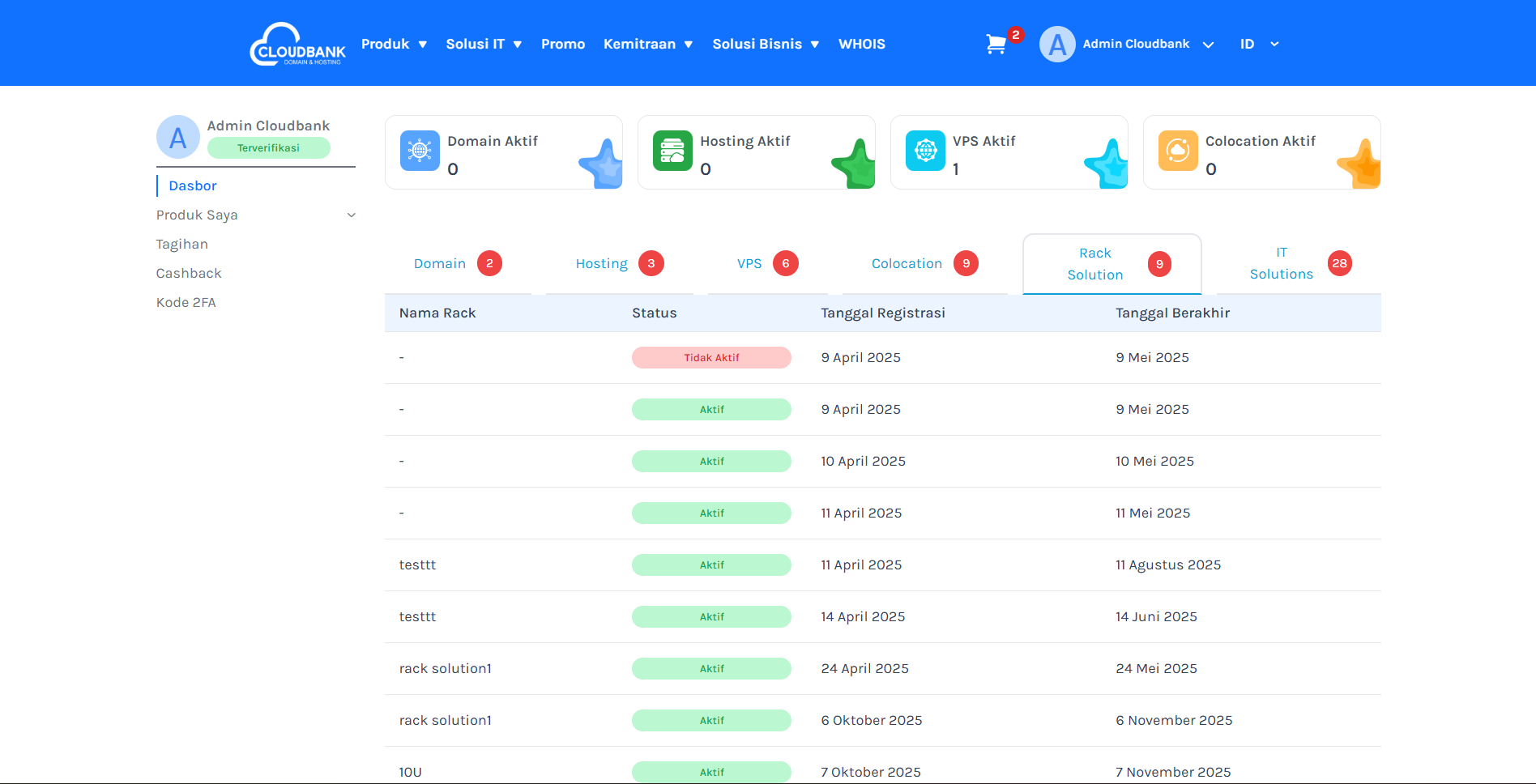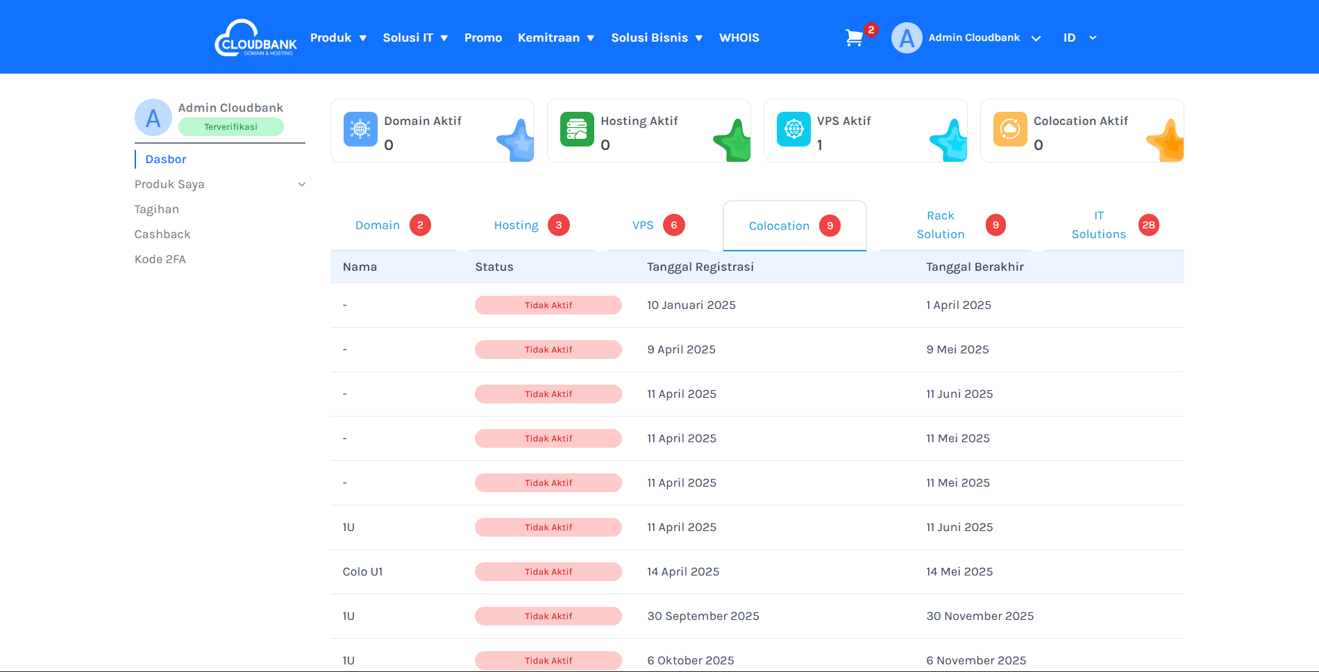 • Menu Utama: Di sini Anda bisa melihat status layanan yang Anda miliki seperti Domain, Hosting, VPS, Colocation, dan Rack Solution.