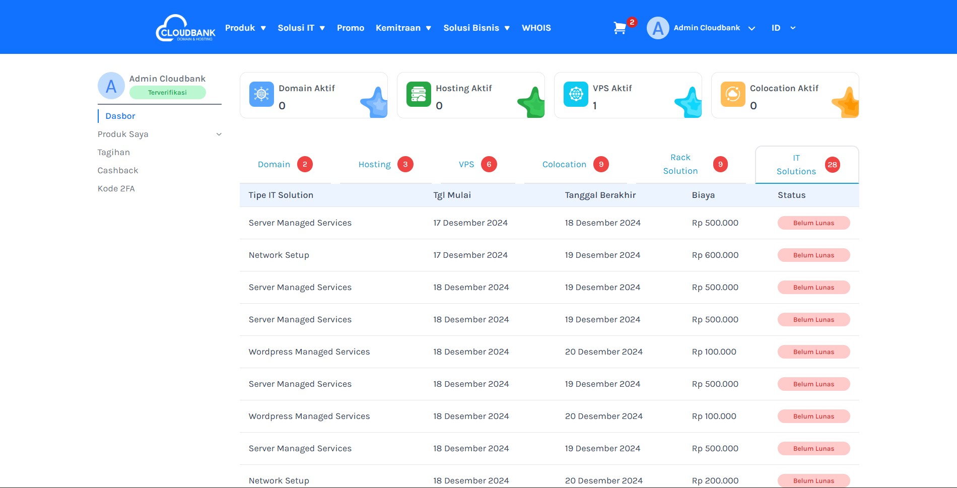 • IT Solutions: Menampilkan layanan solusi IT yang Anda miliki, dengan rincian seperti Nama Solusi, Tanggal Mulai, Tanggal Berakhir, Biaya, dan Status layanan yang telah Anda pilih.