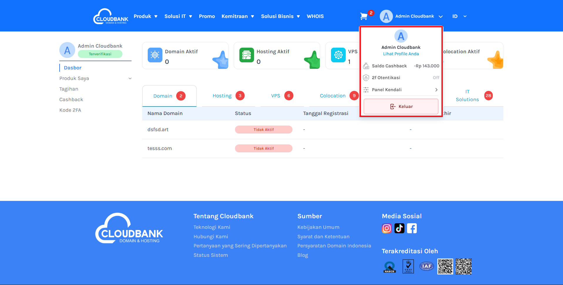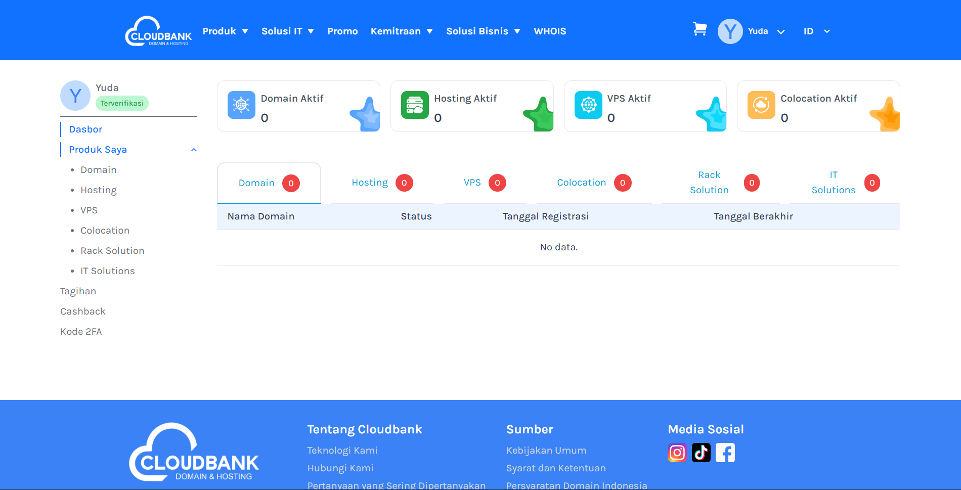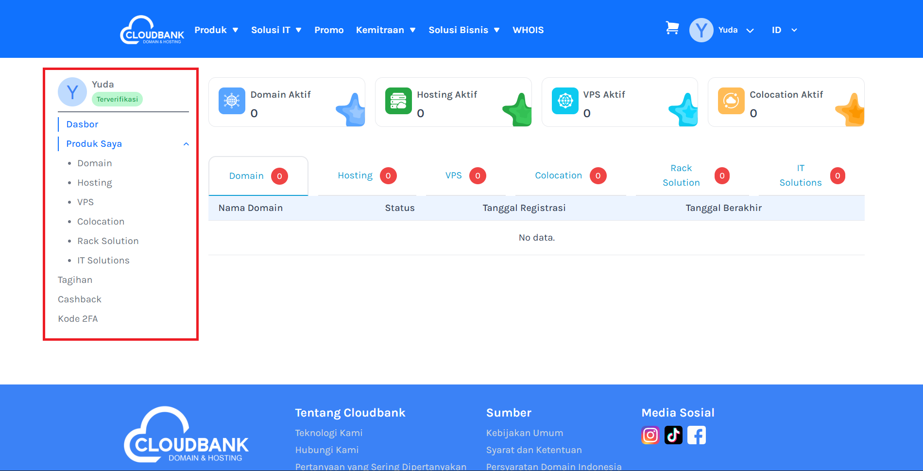 Halaman ini berisi panduan lengkap tentang bagaimana cara menggunakan Dashboard Cloudbank untuk mengelola layanan domain, hosting, VPS, dan layanan lainnya.