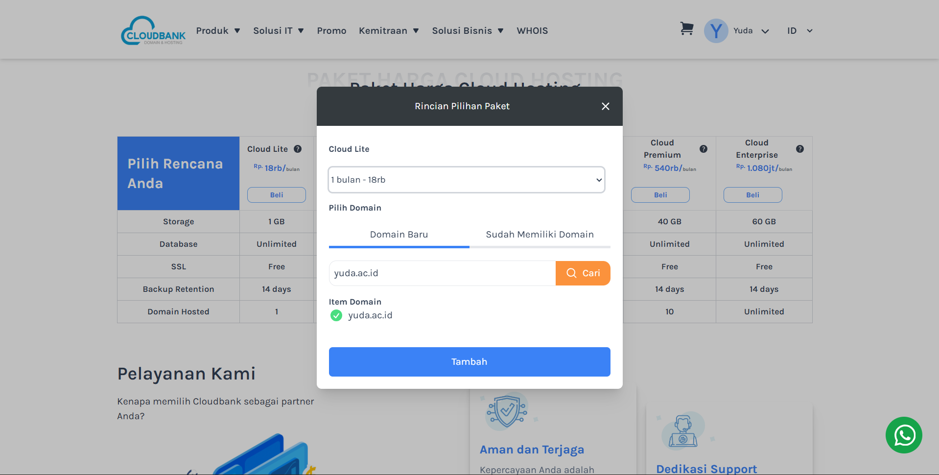 Pada halaman Hosting, Anda dapat memilih paket hosting yang sesuai dengan kebutuhan Anda. Pilih paket seperti Cloud Lite, Cloud Startup, Cloud Premium, dan lainnya, sesuai dengan kapasitas penyimpanan dan harga yang ditawarkan.