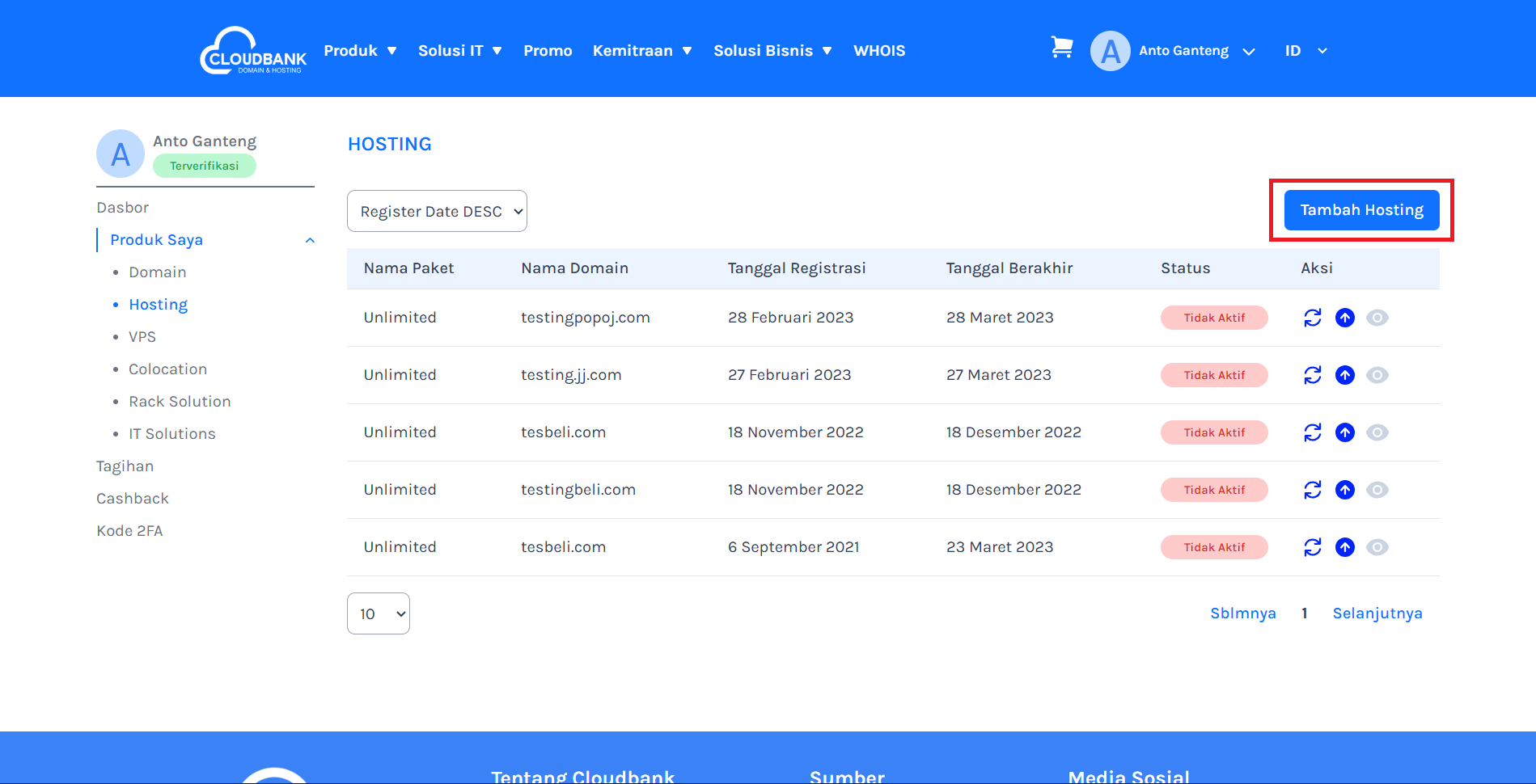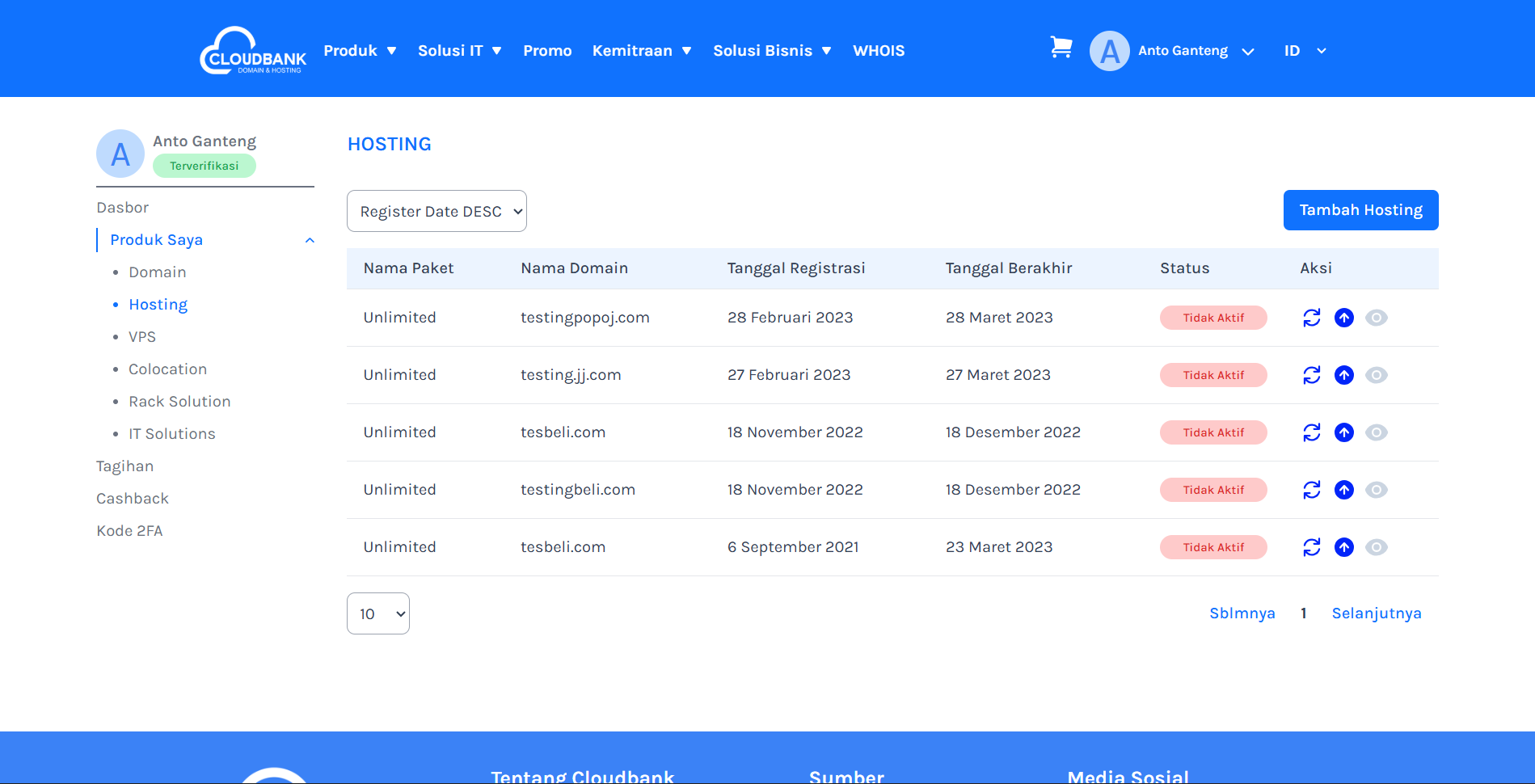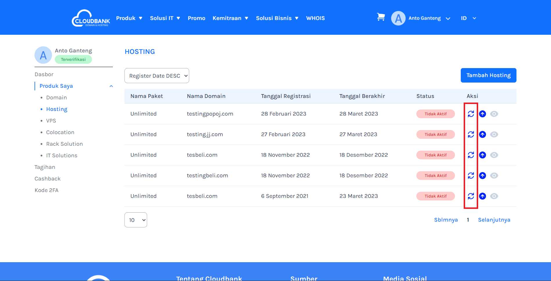 Di halaman Hosting, Anda akan melihat daftar paket hosting Anda yang sudah terdaftar, termasuk yang telah kadaluarsa. Pilih paket hosting yang statusnya Tidak Aktif.