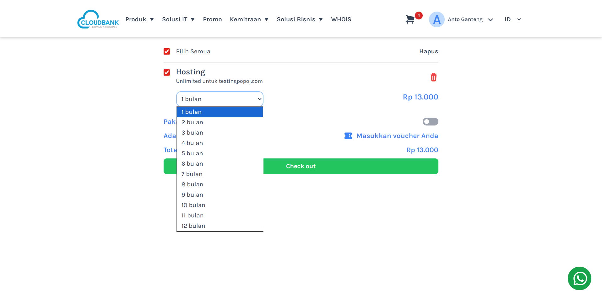 Di halaman Pembayaran, pilih durasi yang sesuai untuk pembaruan paket hosting Anda, misalnya 1 bulan, 3 bulan, atau lebih panjang.