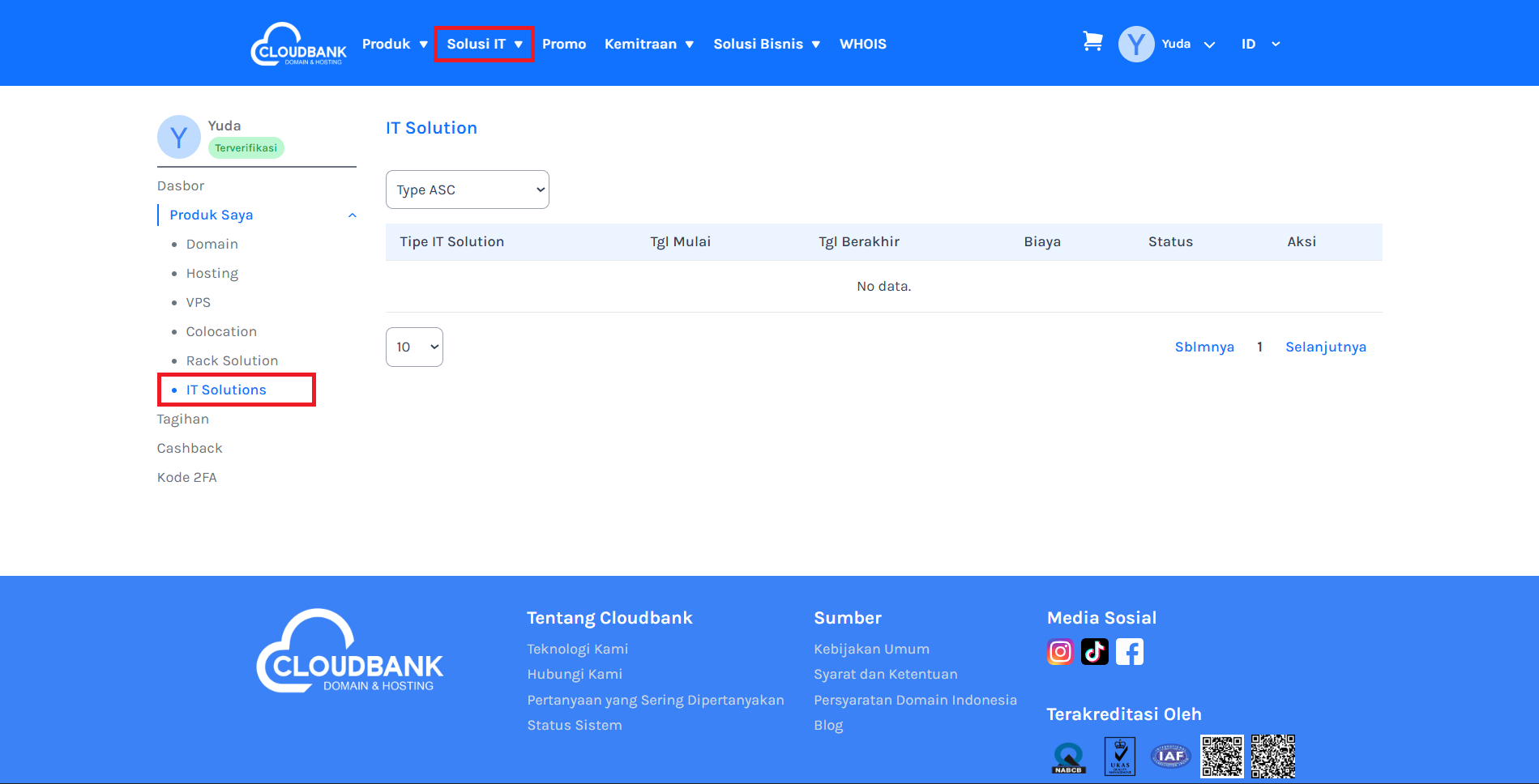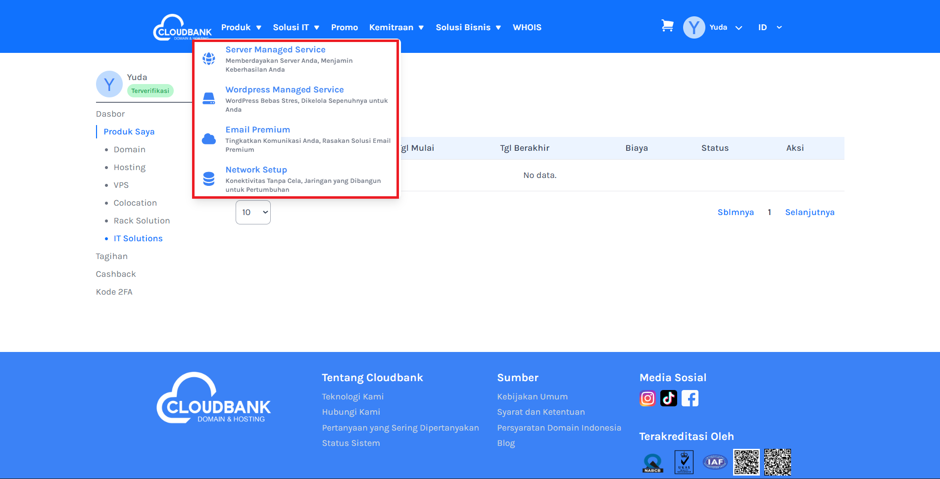 Setelah berhasil login ke Dashboard Cloudbank, pilih menu Produk Saya di sebelah kiri, kemudian klik IT Solutions.