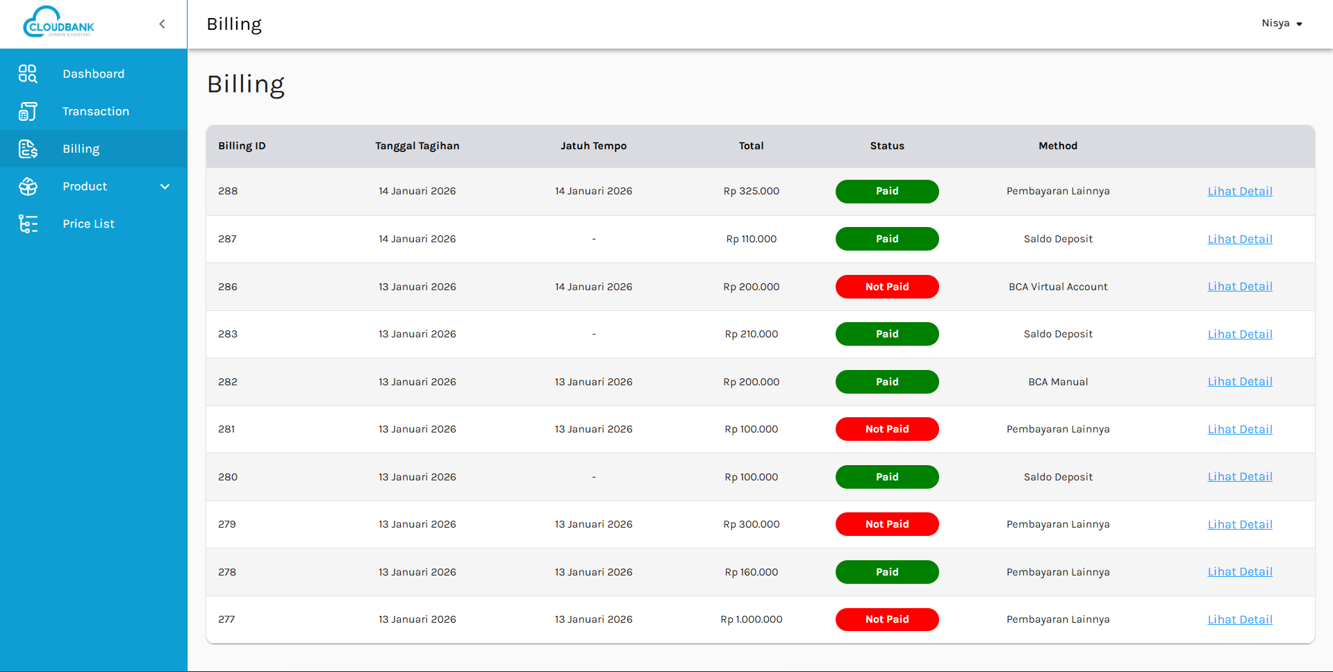 Setelah login, klik menu Billing di panel kiri untuk melihat daftar tagihan yang perlu dibayar. Di halaman ini, Anda akan melihat Billing ID, Tanggal Tagihan, Total Harga, Status Pembayaran, dan Metode Pembayaran.