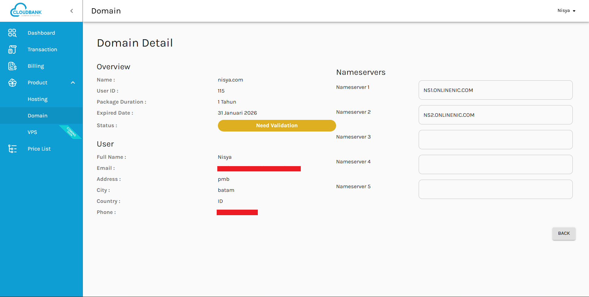 - Nama Domain: Menampilkan nama domain yang terdaftar, seperti nisya.com.